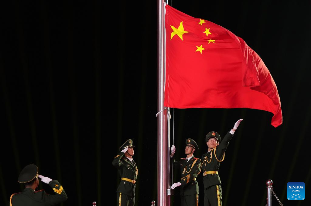 SANYA, 22 abril, 2026 (Xinhua) -- La bandera nacional china es izada durante la ceremonia de apertura de los VI Juegos Asiáticos de Playa, en Sanya, en la provincia de Hainan, en el sur de China, el 22 de abril de 2026. (Xinhua/Li Bo)