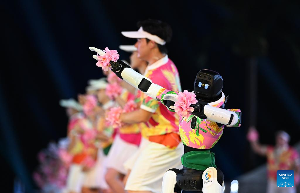 SANYA, 22 abril, 2026 (Xinhua) -- Robots realizan una presentación durante la ceremonia de apertura de los VI Juegos Asiáticos de Playa, en Sanya, en la provincia de Hainan, en el sur de China, el 22 de abril de 2026. (Xinhua/Pan Yulong)
