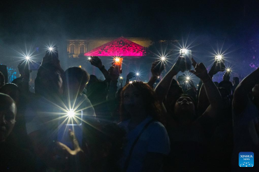 Imagen del 26 de abril de 2026 de personas asistiendo a un espectáculo durante la novena edición del Festival GDLuz 2026, en la ciudad de Guadalajara, en el estado de Jalisco, México. Durante cuatro jornadas, el Centro Histórico de Guadalajara dejó atrás su rutina habitual para convertirse en un vasto escenario de luz, música y tradición, en el que más de un millón de personas recorrieron sus calles para disfrutar de una de las celebraciones culturales más emblemáticas de México. (Xinhua/Miriam Jiménez)