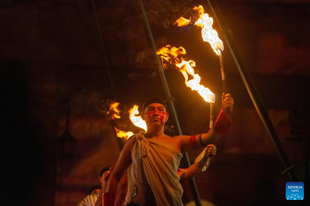 Imagen del 26 de abril de 2026 de un artista participando en el espectáculo Kopalli: El Espíritu Astral durante la novena edición del Festival GDLuz 2026, en la ciudad de Guadalajara, en el estado de Jalisco, México. Durante cuatro jornadas, el Centro Histórico de Guadalajara dejó atrás su rutina habitual para convertirse en un vasto escenario de luz, música y tradición, en el que más de un millón de personas recorrieron sus calles para disfrutar de una de las celebraciones culturales más emblemáticas de México. (Xinhua/Miriam Jiménez)