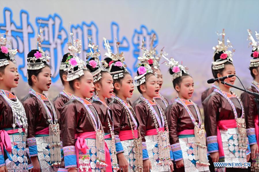 QIANDONGNAN, 27 diciembre, 2020 (Xinhua) -- Cantantes realizan una presentación durante una competencia de coros del grupo étnico dong, en el distrito de Congjiang, en la provincia de Guizhou, en el suroeste de China, el 27 de diciembre de 2020. Un total de 78 coros de los distritos de Congjiang y Liping de la provincia participaron en la competencia el domingo. Canciones dong, las canciones folclóricas del grupo étnico dong, son interpretadas con un grupo de personas para elaborar un canto polifónico denominado Gran Coro Kam sin instrumentos musicales o director. Fue inscrito en la Lista de Patrimonio Cultural Inmaterial en el año 2009. (Xinhua/Luo Jinglai)