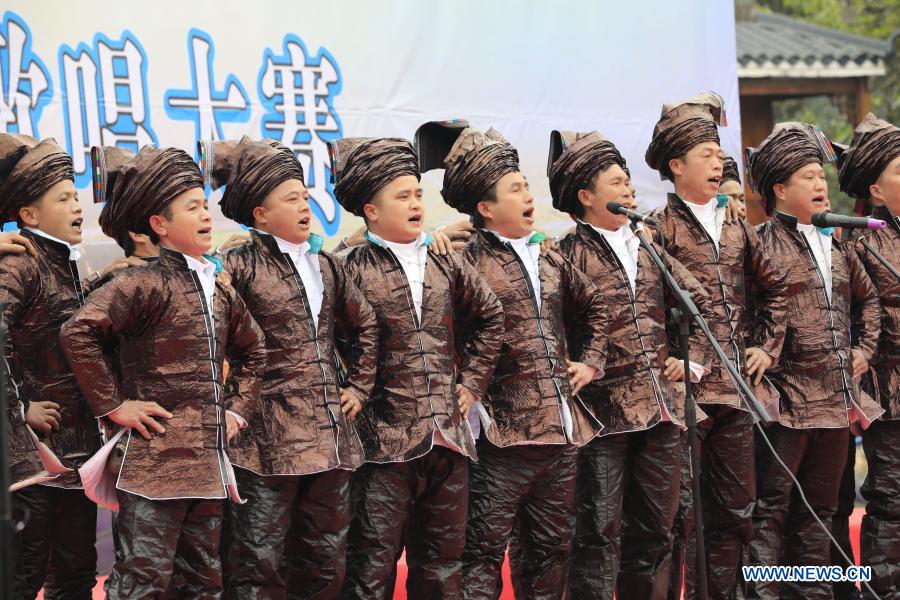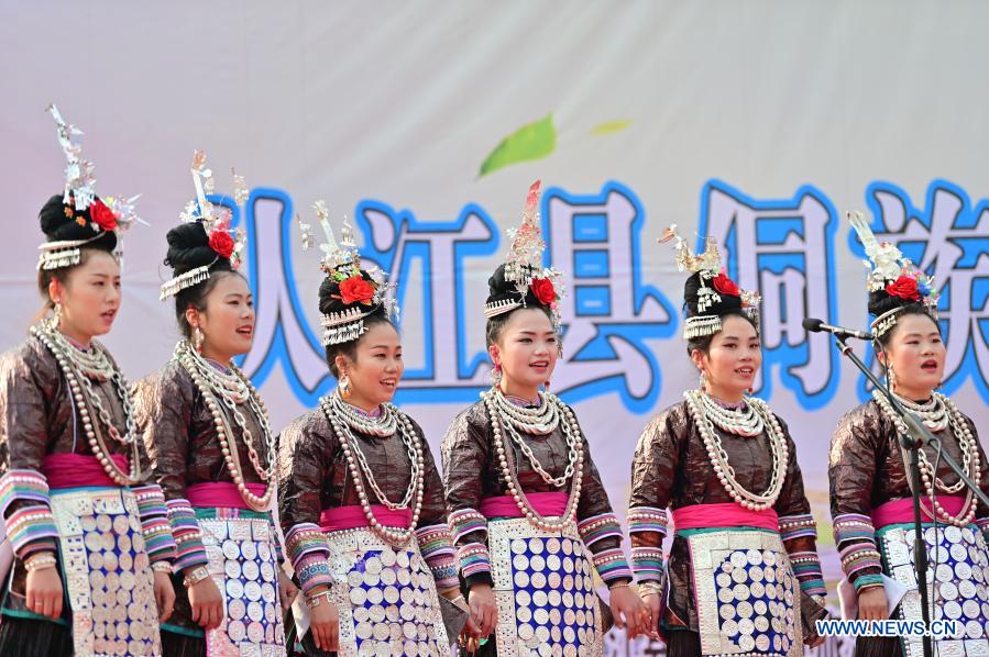 QIANDONGNAN, 27 diciembre, 2020 (Xinhua) -- Cantantes realizan una presentación durante una competencia de coros del grupo étnico dong, en el distrito de Congjiang, en la provincia de Guizhou, en el suroeste de China, el 27 de diciembre de 2020. Un total de 78 coros de los distritos de Congjiang y Liping de la provincia participaron en la competencia el domingo. Canciones dong, las canciones folclóricas del grupo étnico dong, son interpretadas con un grupo de personas para elaborar un canto polifónico denominado Gran Coro Kam sin instrumentos musicales o director. Fue inscrito en la Lista de Patrimonio Cultural Inmaterial en el año 2009. (Xinhua/Wu Dejun)