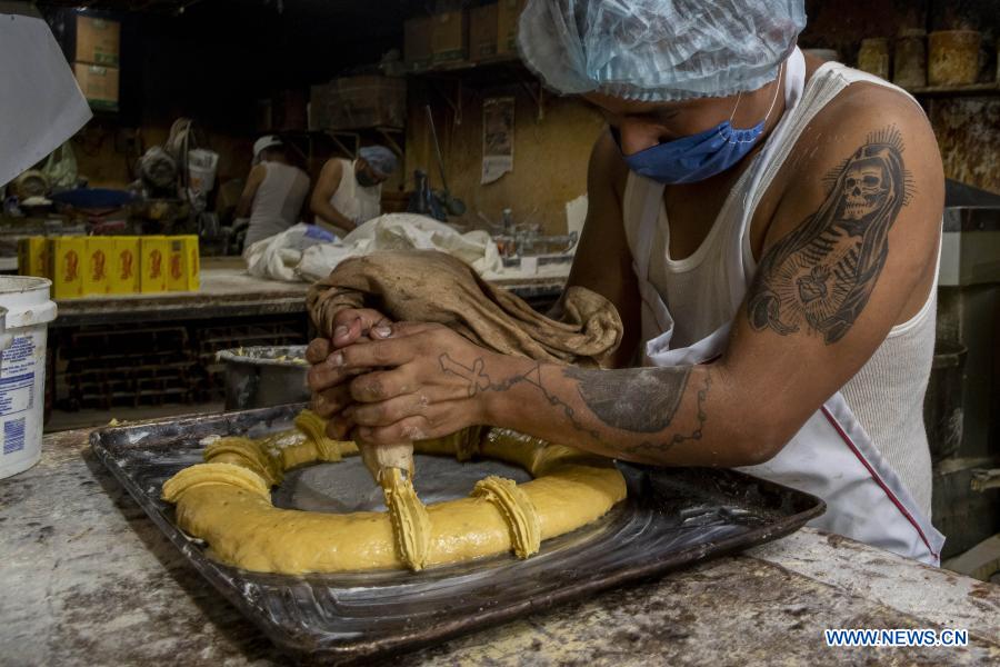 TLALNEPANTLA, 3 enero, 2021 (Xinhua) -- Panaderos elaboran las tradicionales "Roscas de Reyes" en una panadería, en Tlalnepantla, México, el 3 de enero de 2021. Según la tradición mexicana, cada miembro de la familia corta un pedazo de la rosca para degustarlo; sin embargo, las personas que encuentren los muñecos que están escondidos en la rosca, ofrecerán tamales y atole el próximo 2 de febrero, en la celebración del Día de la Candelaria en México. (Xinhua/Montserrat López)