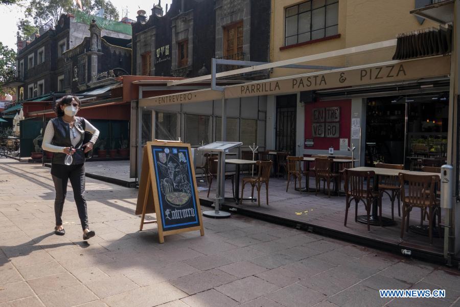 CIUDAD DE MEXICO, 18 enero, 2021 (Xinhua) -- Una mujer camina frente a un restaurante reabierto, en la Ciudad de México, capital de México, el 18 de enero de 2021. (Xinhua/Luis Licona)
