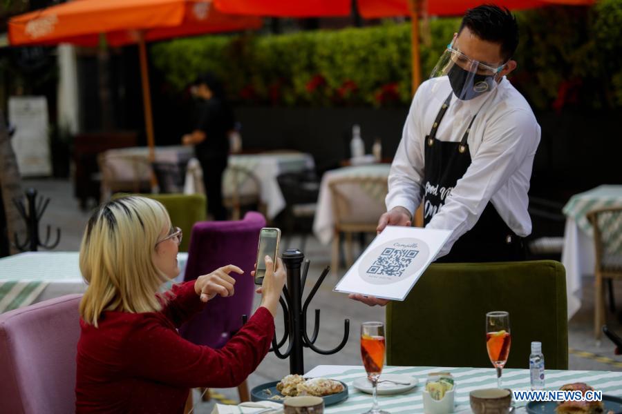 CIUDAD DE MEXICO, 18 enero, 2021 (Xinhua) -- Un mesero ofrece el código QR a una comensal en la terraza de un restaurante reabierto, en la Ciudad de México, capital de México, el 18 de enero de 2021. (Xinhua/Francisco Cañedo)