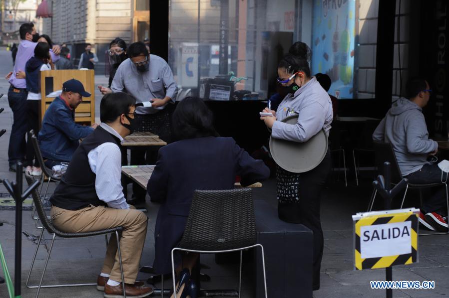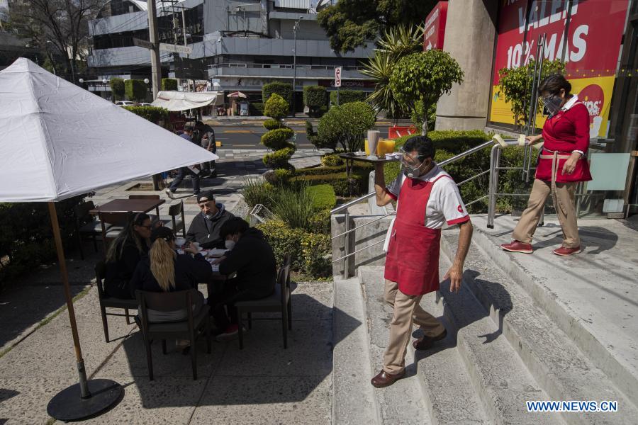 CIUDAD DE MEXICO, 18 enero, 2021 (Xinhua) -- Meseros atienden a comensales en la terraza de un restaurante reabierto, en la Ciudad de México, capital de México, el 18 de enero de 2021. (Xinhua/Ricardo Flores)
