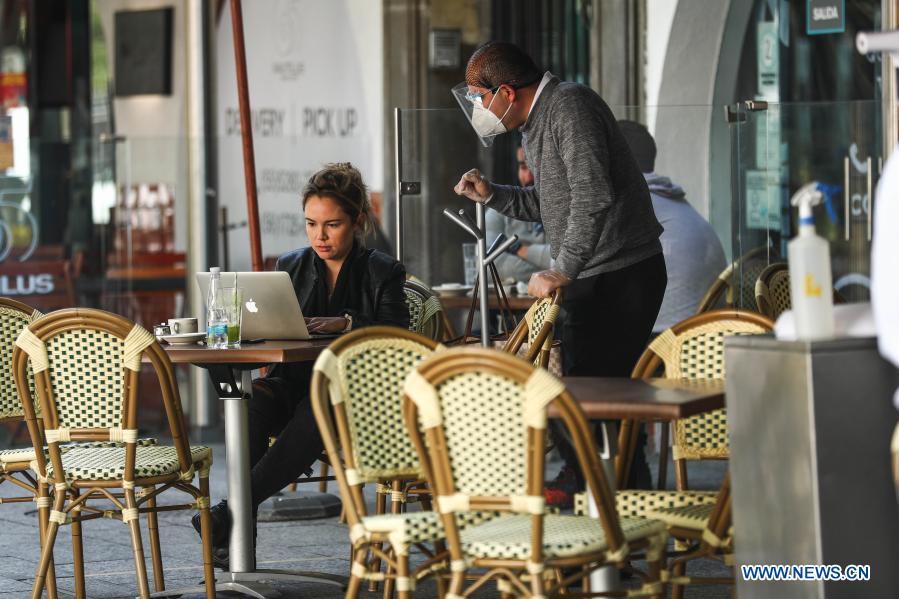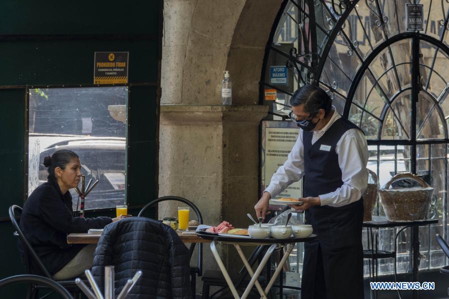 CIUDAD DE MEXICO, 18 enero, 2021 (Xinhua) -- Un mesero atiende a una comensal en la terraza de un restaurante reabierto, en la Ciudad de México, capital de México, el 18 de enero de 2021. (Xinhua/Montserrat López)