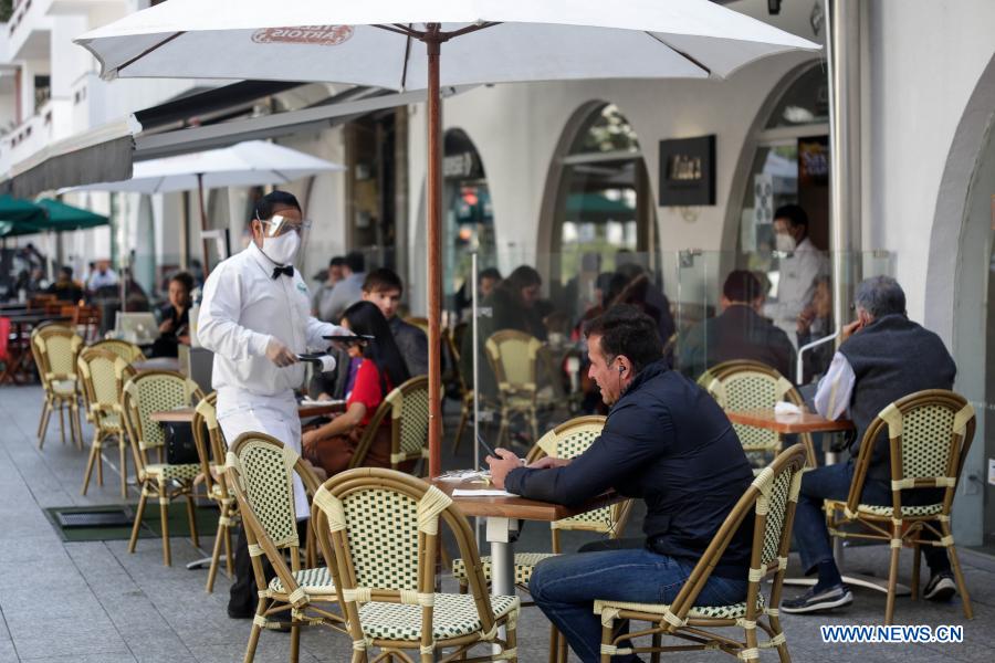CIUDAD DE MEXICO, 18 enero, 2021 (Xinhua) -- Un mesero atiende a comensales sentados en mesas ubicadas sobre la baqueta frente a un restaurante reabierto, en la Ciudad de México, capital de México, el 18 de enero de 2021. (Xinhua/Sunny Quintero)
