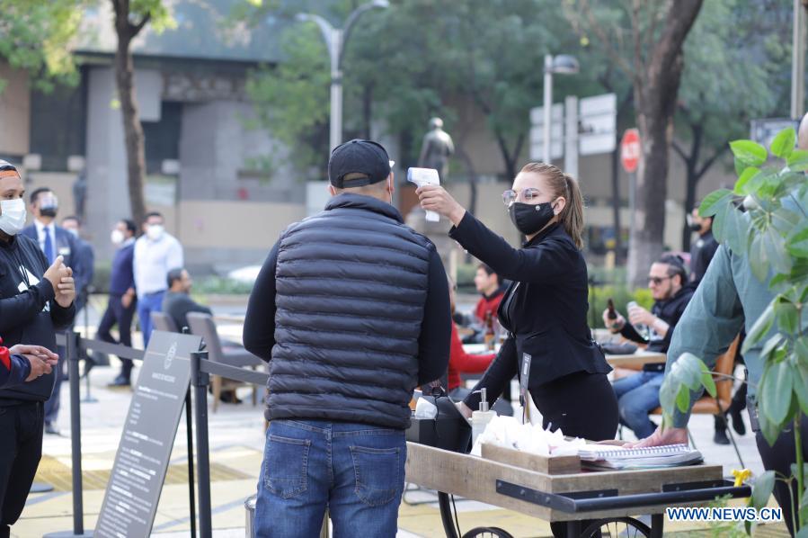 CIUDAD DE MEXICO, 18 enero, 2021 (Xinhua) -- Una empleada de un restaurante mide la temperatura corporal de un comensal en la entrada de un restaurante reabierto, en la Ciudad de México, capital de México, el 18 de enero de 2021. (Xinhua/Sunny Quintero)