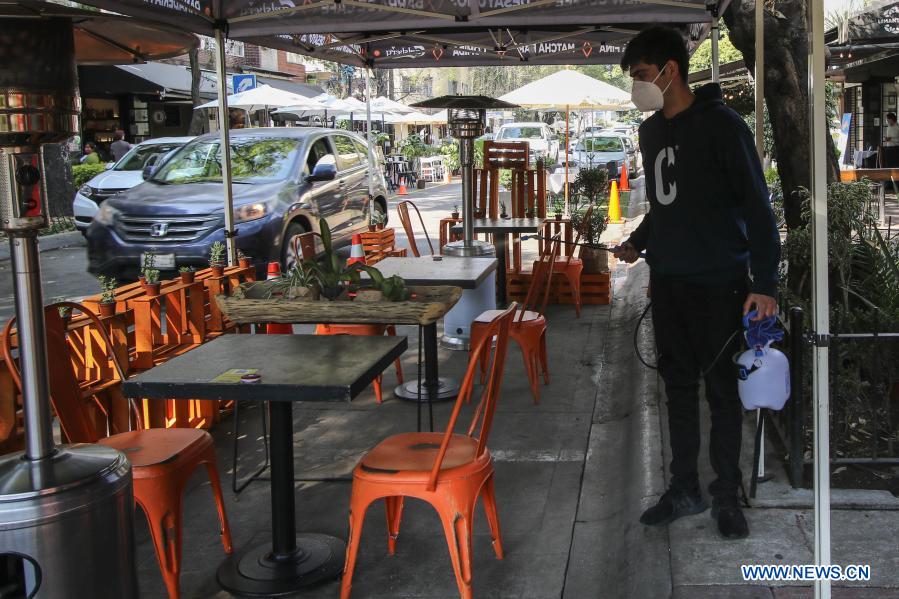 CIUDAD DE MEXICO, 18 enero, 2021 (Xinhua) -- Un trabajador desinfecta mesas en la terraza de un restaurante previo a su reapertura, en la Ciudad de México, capital de México, el 18 de enero de 2021. (Xinhua/Montserrat López)