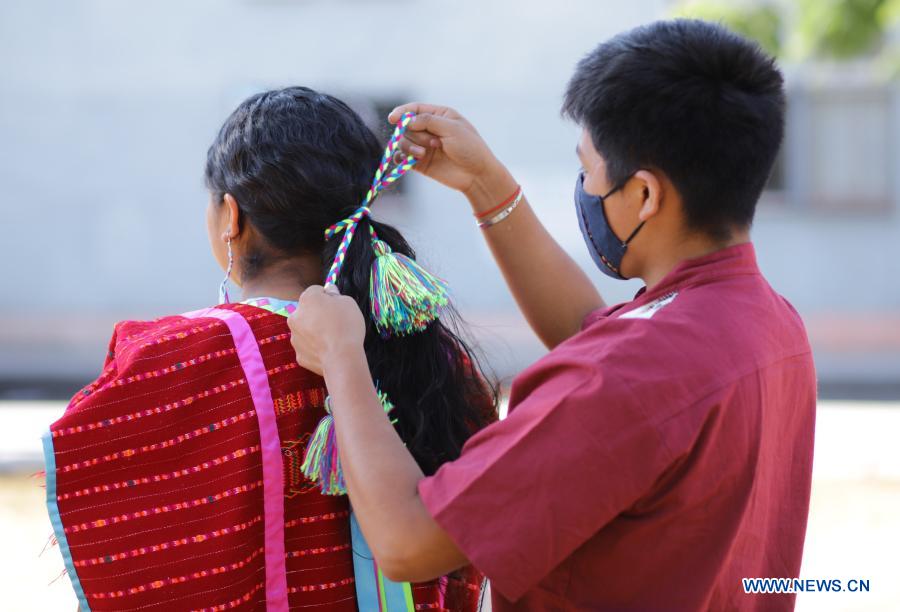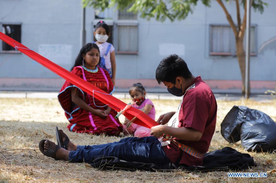 CIUDAD DE MEXICO, 30 enero, 2021 (Xinhua) -- El artesano Julián Aguilar (frente) elabora una prenda de vestir indígena llamada "huipil", tradicional de la comunidad triqui del estado de Oaxaca, con un telar de cintura, junto a su prima Jimena (i-atrás) y sus sobrinas, en un parque, en la Ciudad de México, capital de México, el 30 de enero de 2021. (Xinhua/Sunny Quintero)