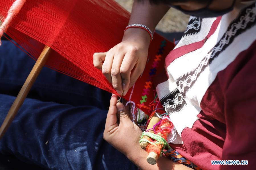 CIUDAD DE MEXICO, 30 enero, 2021 (Xinhua) -- El artesano Julián Aguilar elabora una prenda de vestir indígena llamada "huipil", tradicional de la comunidad triqui del estado de Oaxaca, con un telar de cintura, en un parque, en la Ciudad de México, capital de México, el 30 de enero de 2021. (Xinhua/Sunny Quintero)