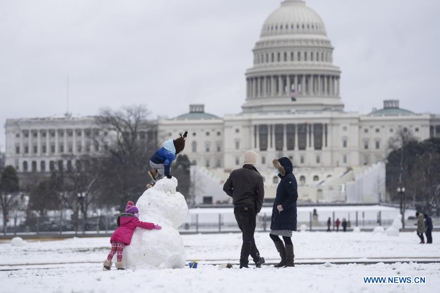 WASHINGTON D.C., 2 febrero, 2021 (Xinhua) -- Personas juegan en la nieve cerca del Capitolio, en Washington D.C., Estados Unidos, el 2 de febrero de 2021. (Xinhua/Liu Jie)