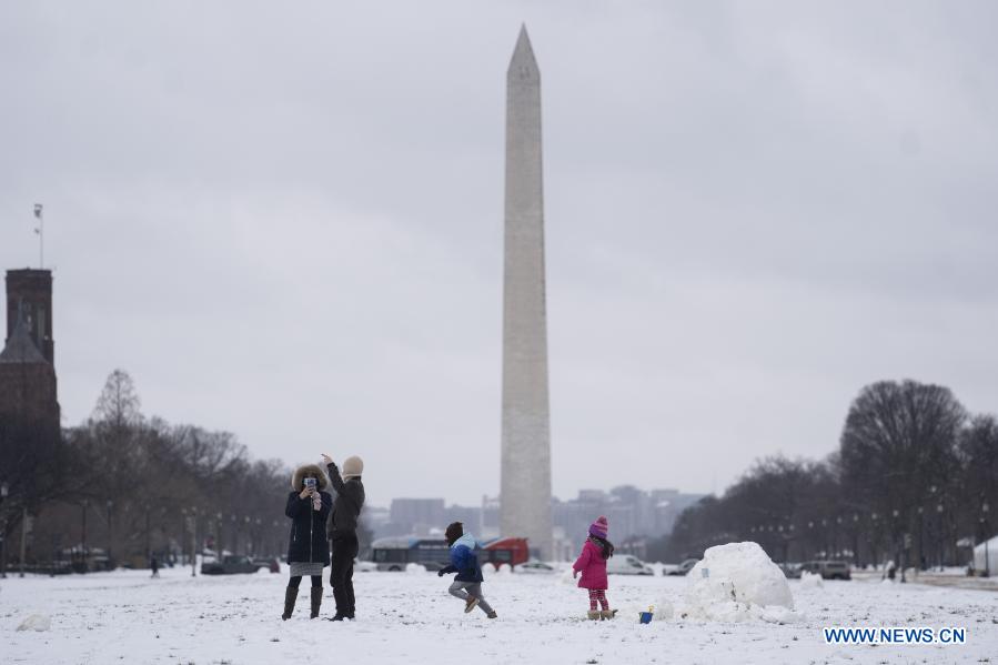 WASHINGTON D.C., 2 febrero, 2021 (Xinhua) -- Personas juegan en la nieve en el National Mall, en Washington D.C., Estados Unidos, el 2 de febrero de 2021. (Xinhua/Liu Jie)