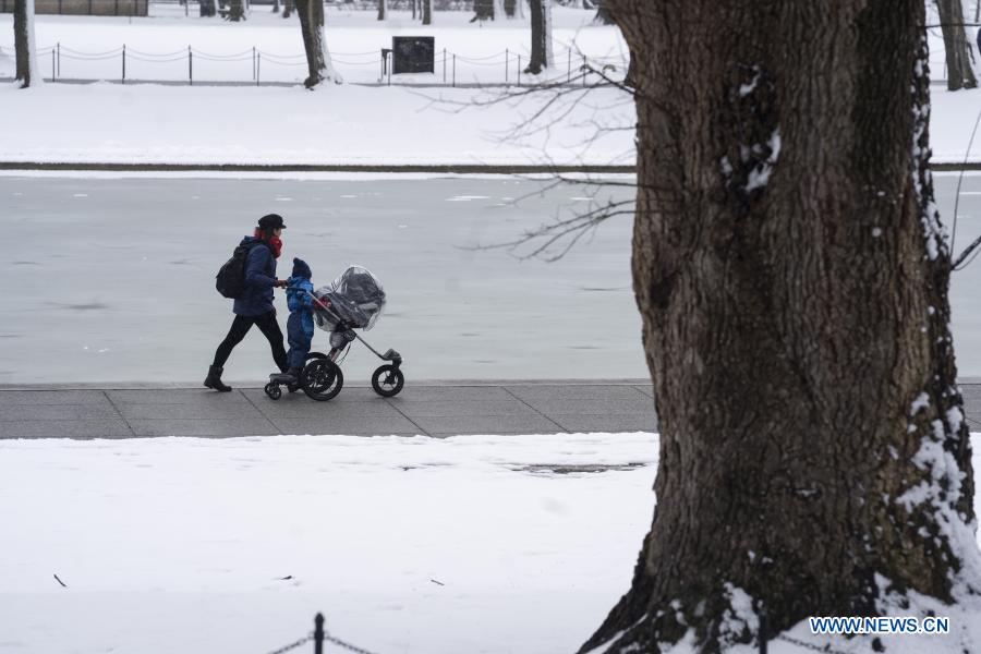 WASHINGTON D.C., 2 febrero, 2021 (Xinhua) -- Personas caminan por el National Mall cubierto de nieve, en Washington D.C., Estados Unidos, el 2 de febrero de 2021. (Xinhua/Liu Jie)