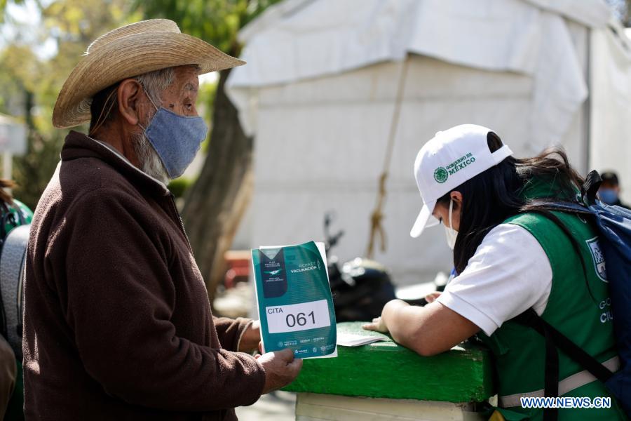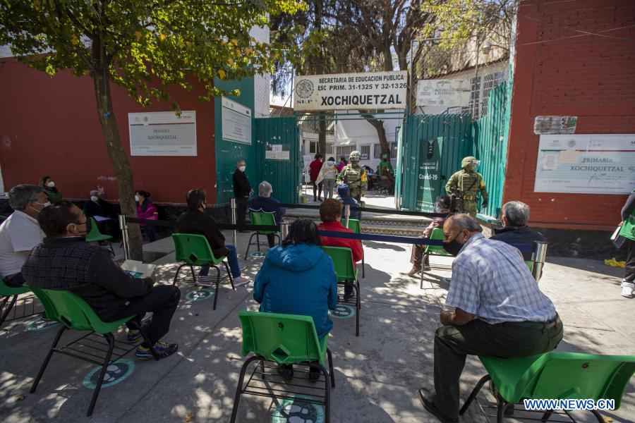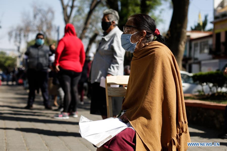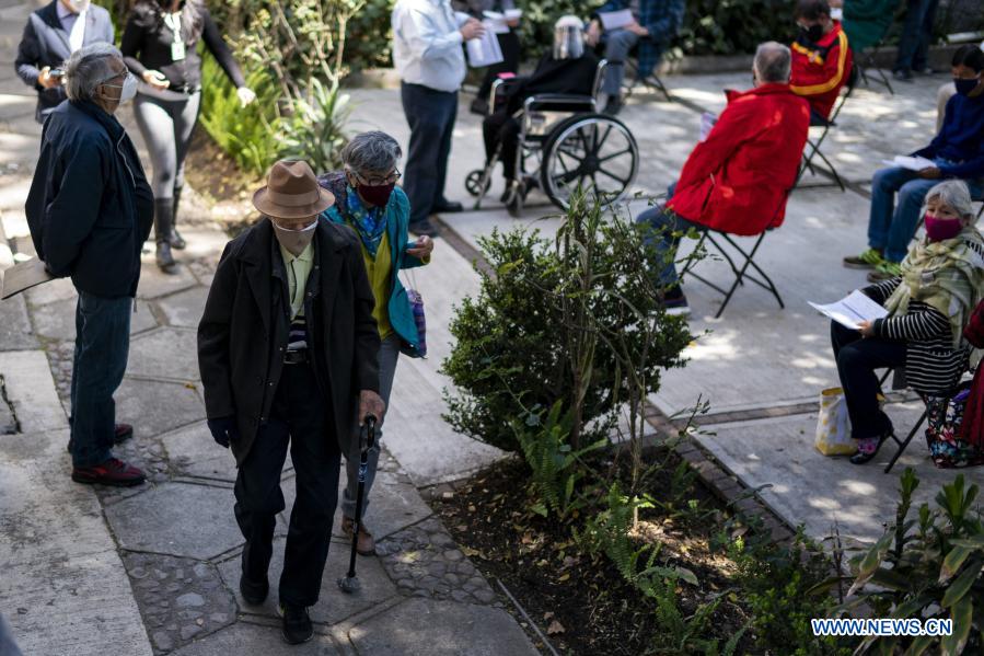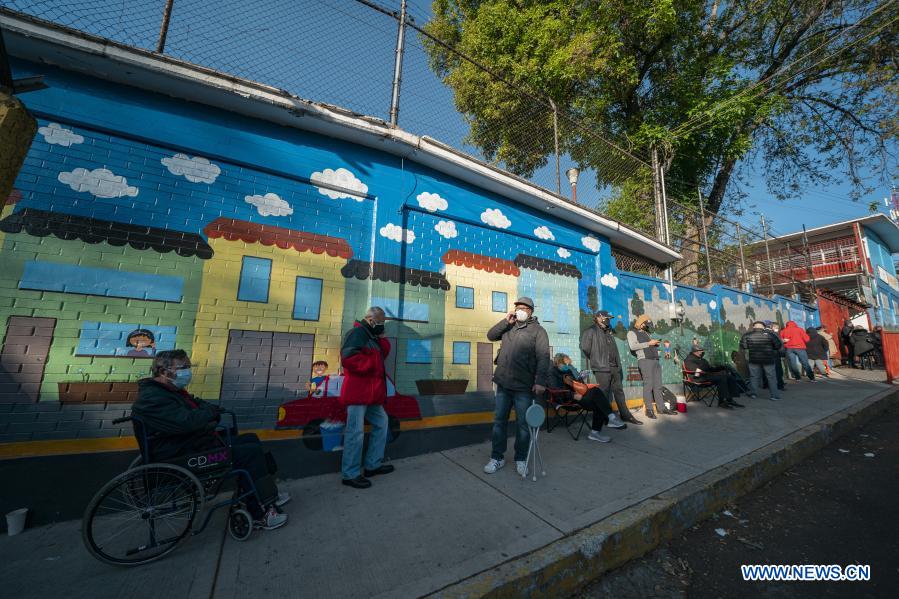 CIUDAD DE MEXICO, 15 febrero, 2021 (Xinhua) -- Personas de la tercera edad esperan su turno para recibir una vacuna contra la enfermedad del nuevo coronavirus (COVID-19), en la Ciudad de México, capital de México, el 15 de febrero de 2021. La vacunación contra la COVID-19 en adultos mayores de 60 años inició el lunes en 333 municipios de alta marginación en los 32 estados de México, informó la Secretaría de Salud. (Xinhua/Ricardo Flores)