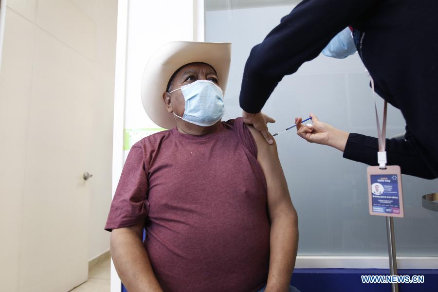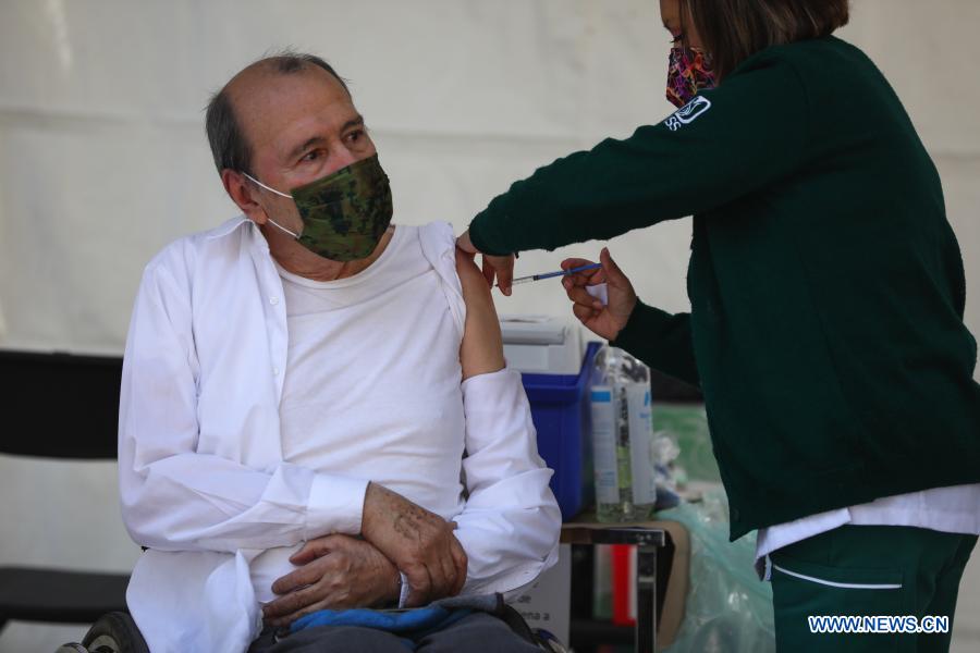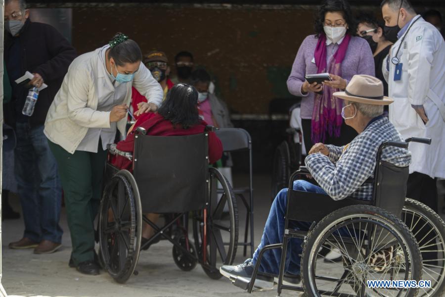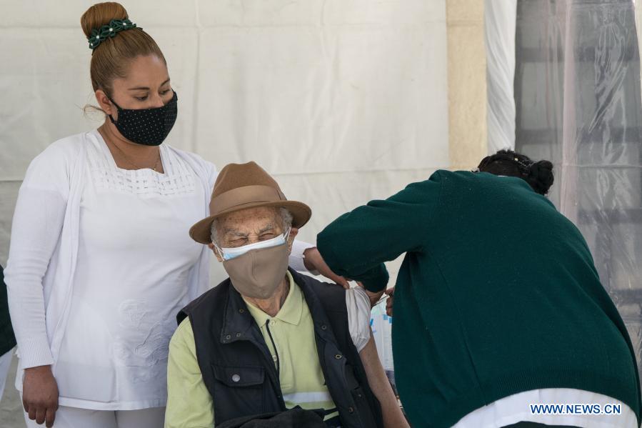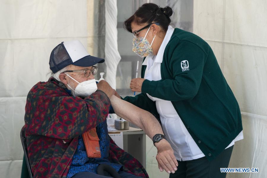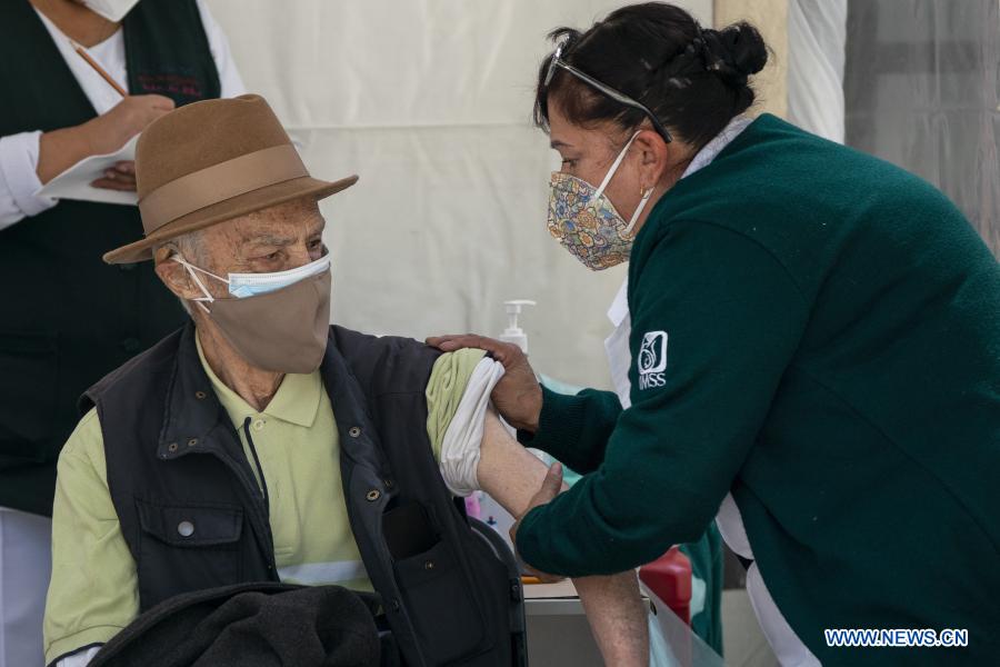 CIUDAD DE MEXICO, 15 febrero, 2021 (Xinhua) -- Una trabajadora de la salud aplica una vacuna contra la enfermedad del nuevo coronavirus (COVID-19) a un hombre de la tercera edad, en la Ciudad de México, capital de México, el 15 de febrero de 2021. La vacunación contra la COVID-19 en adultos mayores de 60 años inició el lunes en 333 municipios de alta marginación en los 32 estados de México, informó la Secretaría de Salud. (Xinhua/Montserrat López)