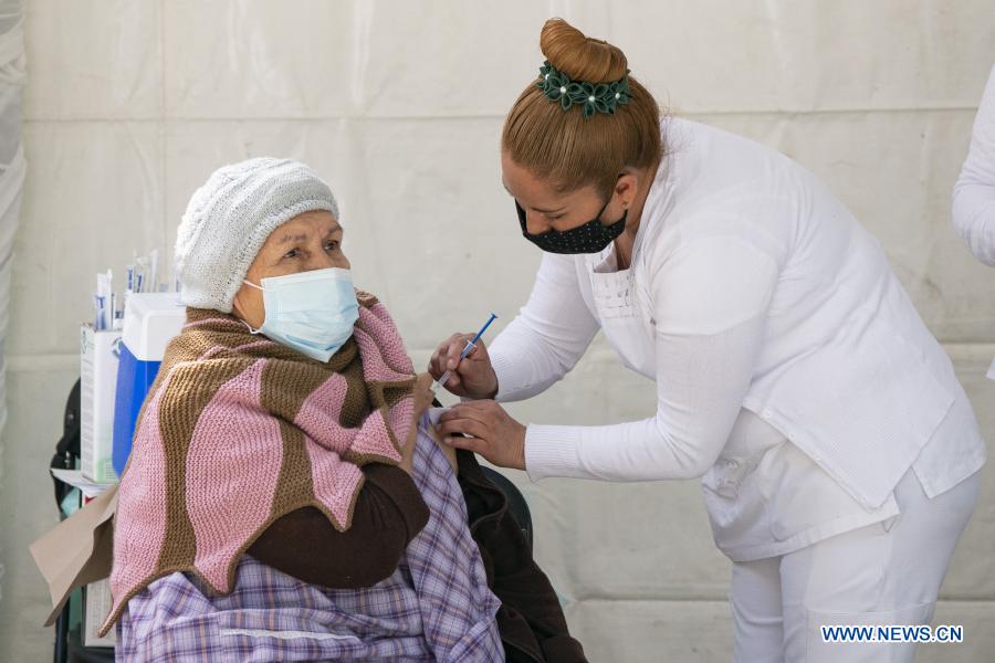 CIUDAD DE MEXICO, 15 febrero, 2021 (Xinhua) -- Una trabajadora de la salud aplica una vacuna contra la enfermedad del nuevo coronavirus (COVID-19) a una mujer de la tercera edad, en la Ciudad de México, capital de México, el 15 de febrero de 2021. La vacunación contra la COVID-19 en adultos mayores de 60 años inició el lunes en 333 municipios de alta marginación en los 32 estados de México, informó la Secretaría de Salud. (Xinhua/Montserrat López)