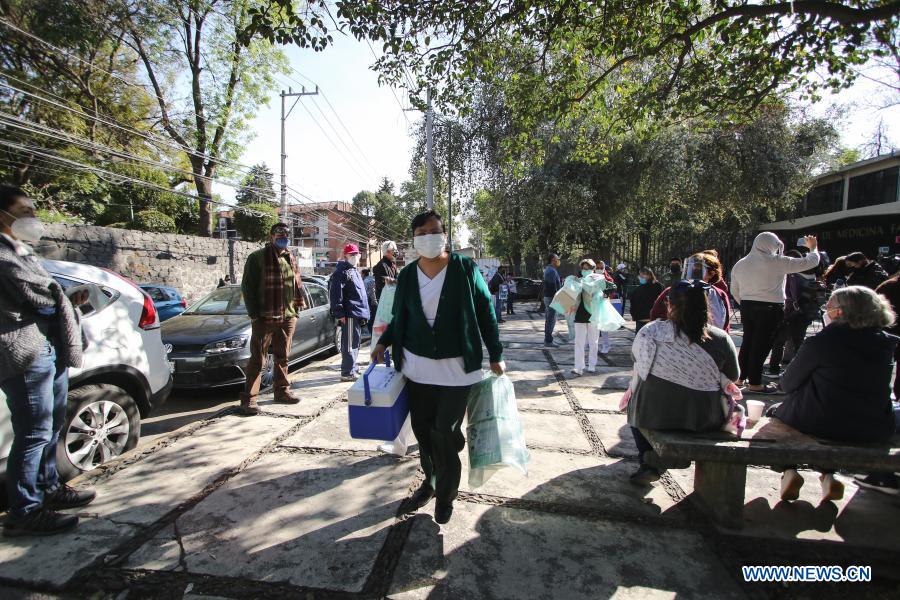 CIUDAD DE MEXICO, 15 febrero, 2021 (Xinhua) -- Una trabajadora de la salud traslada vacunas contra la enfermedad del nuevo coronavirus (COVID-19) para ser aplicadas en personas de la tercera edad, en la Ciudad de México, capital de México, el 15 de febrero de 2021. La vacunación contra la COVID-19 en adultos mayores de 60 años inició el lunes en 333 municipios de alta marginación en los 32 estados de México, informó la Secretaría de Salud. (Xinhua/Montserrat López)