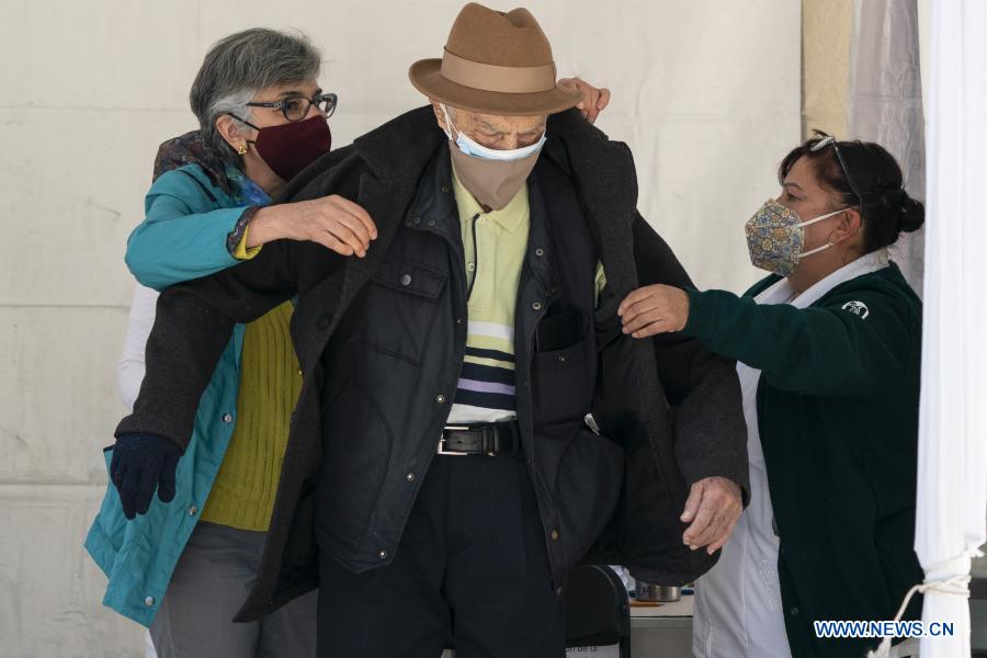 CIUDAD DE MEXICO, 15 febrero, 2021 (Xinhua) -- Arnaldo (c), de 83 años, se coloca sus prendas después de recibir una vacuna contra la enfermedad del nuevo coronavirus (COVID-19), en la Ciudad de México, capital de México, el 15 de febrero de 2021. Arnaldo llegó desde las 6:00 de la mañana y esperó alrededor de 6 horas frente a una Unidad de Medicina para recibir una vacuna contra la COVID-19. La vacunación contra la COVID-19 en adultos mayores de 60 años inició el lunes en 333 municipios de alta marginación en los 32 estados de México, informó la Secretaría de Salud. (Xinhua/Luis Licona)