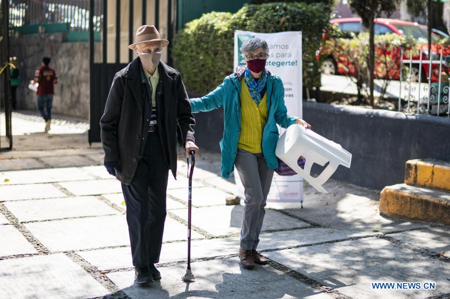 CIUDAD DE MEXICO, 15 febrero, 2021 (Xinhua) -- Arnaldo (i), de 83 años, se retira despúes de recibir una vacuna contra la enfermedad del nuevo coronavirus (COVID-19), en la Ciudad de México, capital de México, el 15 de febrero de 2021. Arnaldo llegó desde las 6:00 de la mañana y espero alrededor de 6 horas frente a una Unidad de Medicina Familiar para recibir la vacuna contra la COVID-19. La vacunación contra la COVID-19 en adultos mayores de 60 años inició el lunes en 333 municipios de alta marginación en los 32 estados de México, informó la Secretaría de Salud. (Xinhua/Luis Licona)