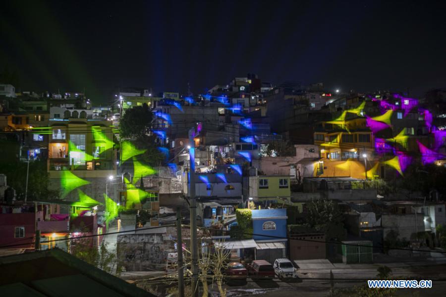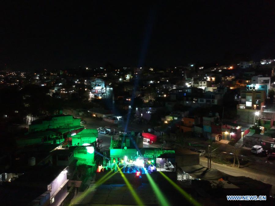 NAUCALPAN, 21 febrero, 2021 (Xinhua) -- Imagen del 20 de febrero de 2021 de viviendas iluminadas con las luces del "Sonido Conquistador Latino" del sonidero Roberto García durante su presentación, en la colonia El Mirador, en Naucalpan, México. El sonidero Roberto García realizó una presentación con su "Sonido Conquistador Latino" en la azotea de su casa para animar a las personas de su colonia. "Sonidero", es el DJ o animador, quien puede ser propietario de equipo de audio, luces y video, que organiza bailes públicos, los cuales algunas veces se realizan en la calle. (Xinhua/Ricardo Flores)