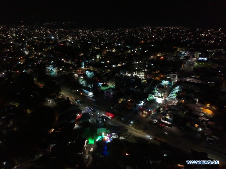 NAUCALPAN, 21 febrero, 2021 (Xinhua) -- Imagen tomada con un dron el 20 de febrero de 2021 de la presentación del "Sonido Conquistador Latino" del sonidero Roberto García, en la colonia El Mirador, en Naucalpan, México. El sonidero Roberto García realizó una presentación con su "Sonido Conquistador Latino" en la azotea de su casa para animar a las personas de su colonia. "Sonidero", es el DJ o animador, quien puede ser propietario de equipo de audio, luces y video, que organiza bailes públicos, los cuales algunas veces se realizan en la calle. (Xinhua/Luis Licona)