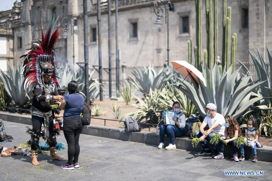 CIUDAD DE MEXICO, 3 marzo, 2021 (Xinhua) -- Una mujer participa en un ritual en una calle del Centro Histórico, en la Ciudad de México, capital de México, el 3 de marzo de 2021. (Xinhua/Luis Licona)