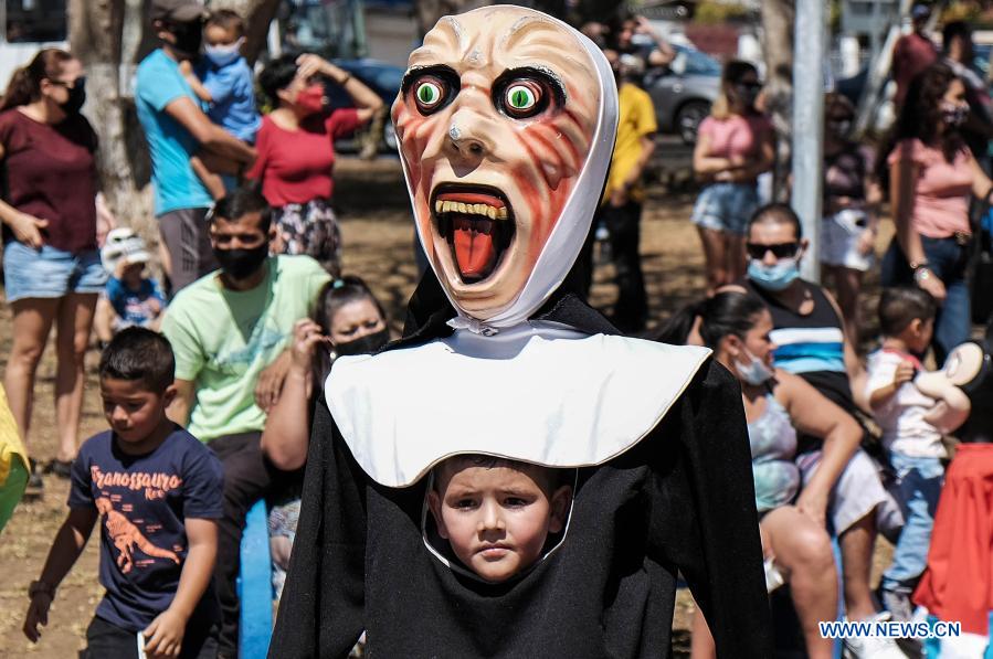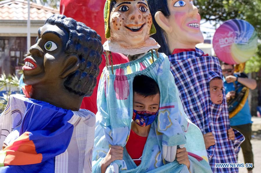 HEREDIA, 14 marzo, 2021 (Xinhua) -- Niños disfrazados participan en la tradicional "Mascarada de Verano", en Santo Domingo, en Heredia, Costa Rica, el 14 de marzo de 2021. La "Mascarada de Verano"es una actividad que consiste en un tradicional recorrido donde niños y adultos bailan al son de una banda de música popular conocida como "Cimarrona". (Xinhua/Esteban Dato)