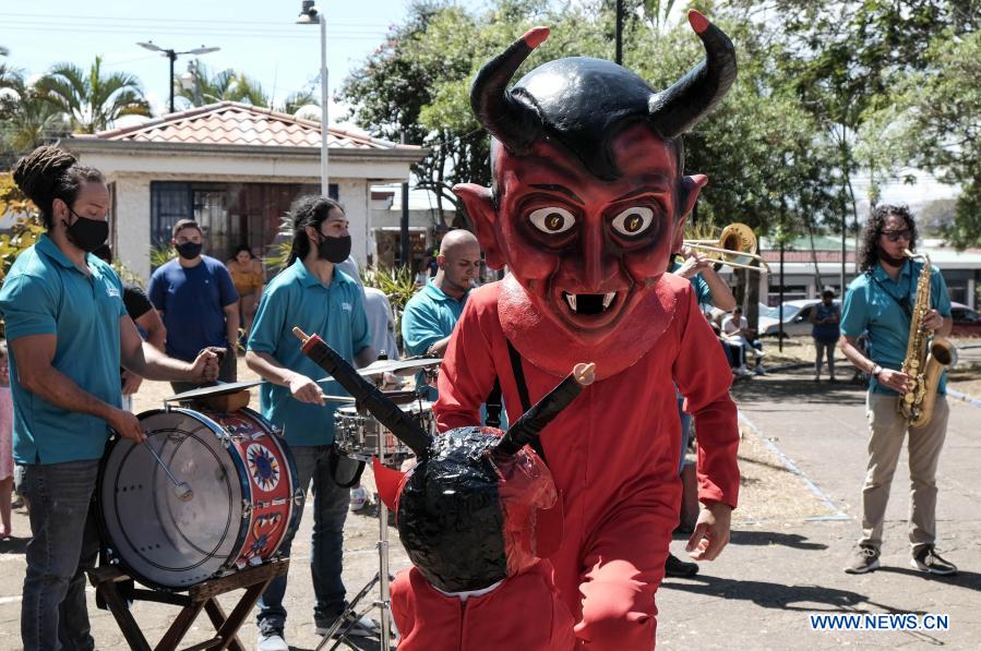 HEREDIA, 14 marzo, 2021 (Xinhua) -- Personas disfrazadas participan en la tradicional "Mascarada de Verano", en Santo Domingo, en Heredia, Costa Rica, el 14 de marzo de 2021. La "Mascarada de Verano"es una actividad que consiste en un tradicional recorrido donde niños y adultos bailan al son de una banda de música popular conocida como "Cimarrona". (Xinhua/Esteban Dato)