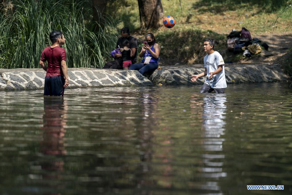 CIUDAD DE MEXICO, 18 abril, 2021 (Xinhua) -- Jóvenes juegan en un lago en el Parque Nacional Fuentes Brotantes, en la Ciudad de México, capital de México, el 18 de abril de 2021. (Xinhua/Luis Licona)