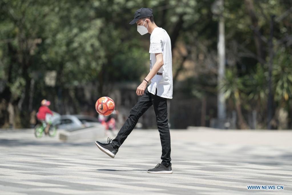 CIUDAD DE MEXICO, 18 abril, 2021 (Xinhua) -- Un joven juega con un balón en el Parque Nacional Fuentes Brotantes, en la Ciudad de México, capital de México, el 18 de abril de 2021. (Xinhua/Luis Licona)