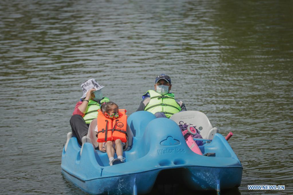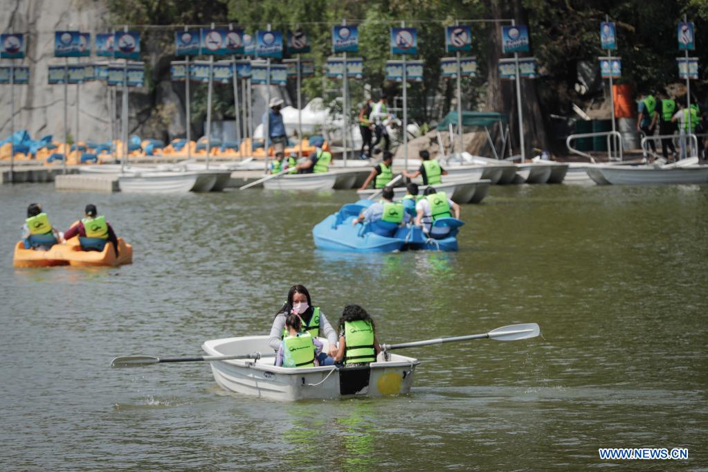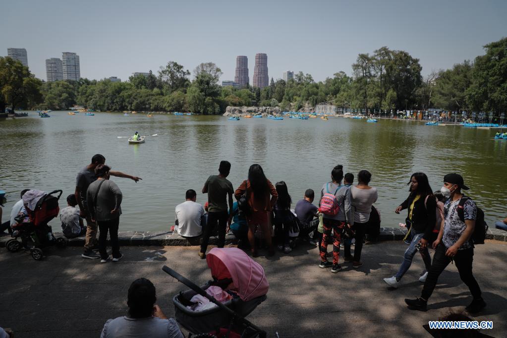 CIUDAD DE MEXICO, 18 abril, 2021 (Xinhua) -- Personas disfrutan de su tiempo libre frente al Lago de Chapultepec, en la Ciudad de México, capital de México, el 18 de abril de 2021. (Xinhua/Quetzali Blanco)
