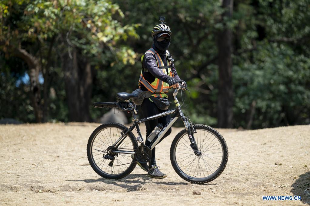 CIUDAD DE MEXICO, 18 abril, 2021 (Xinhua) -- Un hombre sostiene su bicicleta mientras camina por el Parque Nacional Fuentes Brotantes, en la Ciudad de México, capital de México, el 18 de abril de 2021. (Xinhua/Luis Licona)
