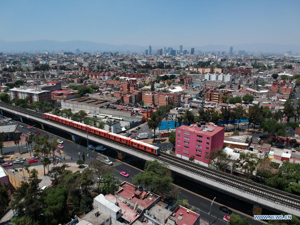 CIUDAD DE MEXICO, 19 abril, 2021 (Xinhua) -- Imagen tomada con un dron de un tren del Metro en la Ciudad de México, capital de México, el 19 de abril de 2021. (Xinhua/Francisco Cañedo)
