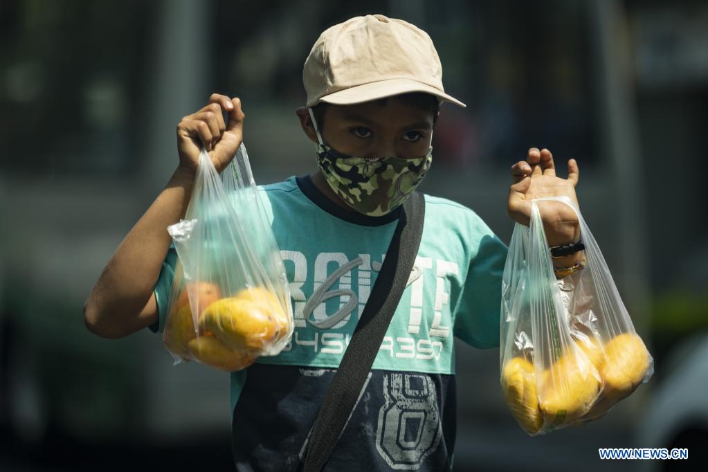 CIUDAD DE MEXICO, 30 abril, 2021 (Xinhua) -- Un niño sostiene bolsas con fruta en una calle en el marco del Día del Niño, en la Ciudad de México, capital de México, el 30 de abril de 2021. (Xinhua/Luis Licona)