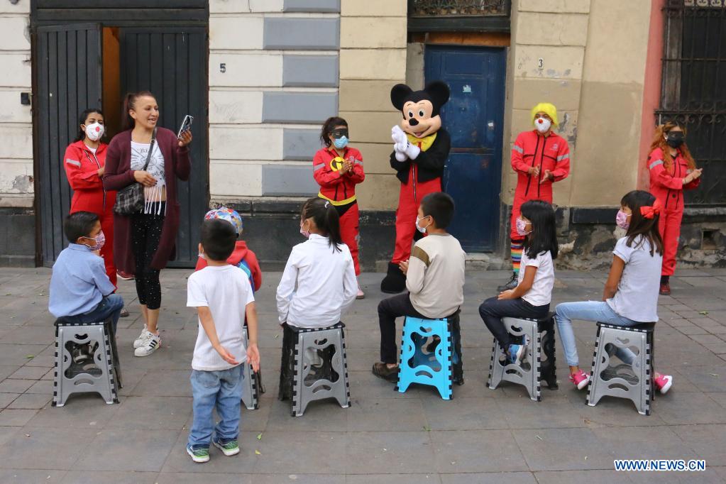 CIUDAD DE MEXICO, 30 abril, 2021 (Xinhua) -- Integrantes de la asociación "El Caracol" ofrecen un espectáculo para niños en situación de calle en el marco del Día del Niño, en la Ciudad de México, capital de México, el 30 de abril de 2021. (Xinhua/Silvana Flores)