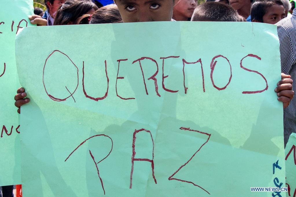 GUERRERO, 30 abril, 2021 (Xinhua) -- Un niño sostiene un cartel durante una marcha contra la violencia en el marco del Día del Niño, en Alcozacán, en el estado de Guerrero, México, el 30 de abril de 2021. (Xinhua/Franyeli García)