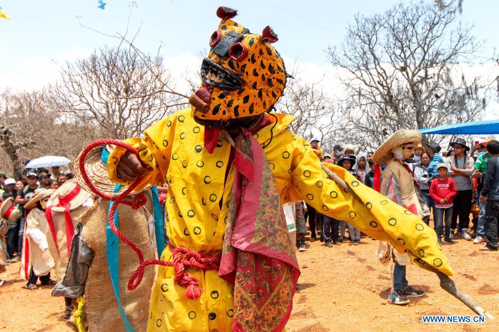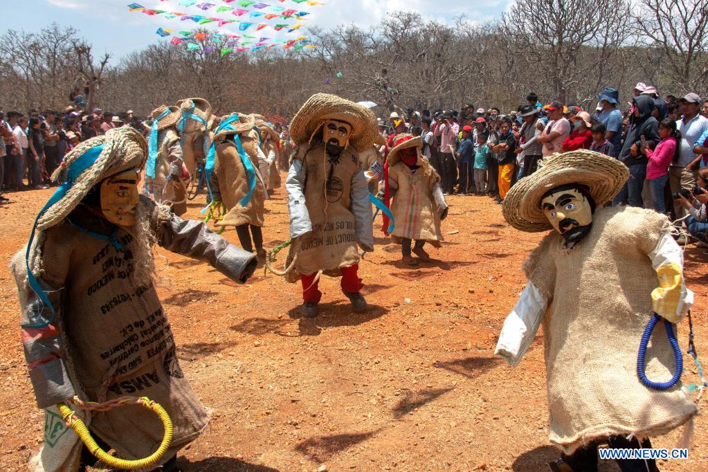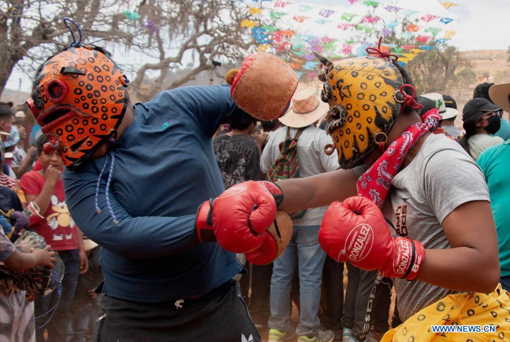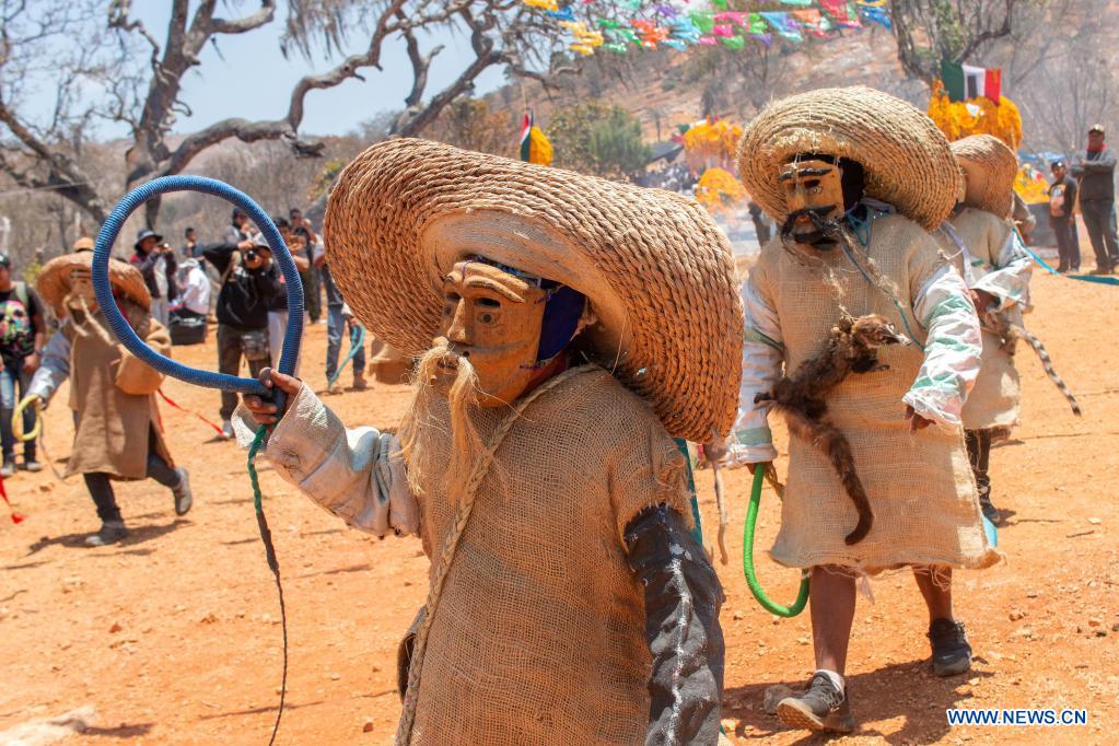 GUERRERO, 3 mayo, 2021 (Xinhua) -- Imagen del 2 de mayo de 2021 de personas disfrazadas participando durante un ritual en un lugar sagrado conocido como cruzco localizado en un cerro, en la comunidad de Acatlán, en el estado de Guerrero, México. Pobladores de la comunidad de Acatlán realizan un ritual donde hombres disfrazados y portando diversas máscaras llevan a cabo danzas y peleas que tienen como finalidad atraer a la lluvia y las buenas cosechas. Este ritual se lleva a cabo del 25 de abril hasta principios de mayo. (Xinhua/Franyeli García)