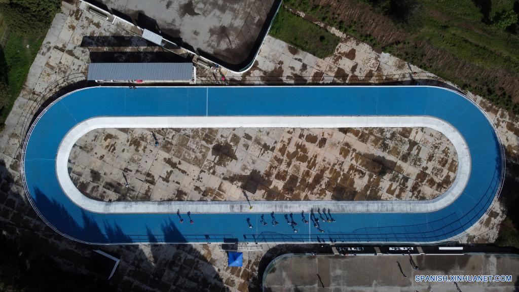 TLAXCALA, 26 junio, 2021 (Xinhua) -- Imagen tomada con un dron de integrantes de la selección de patinaje de velocidad del Instituto Politécnico Nacional participando en una sesión de entrenamiento previo a su participación en los Nacionales de la Comisión Nacional de Cultura Física y Deporte 2021 en un patinódromo, en el municipio de Apizaco, estado de Tlaxcala, México, el 26 de junio de 2021. (Xinhua/Jesús Alvarado)