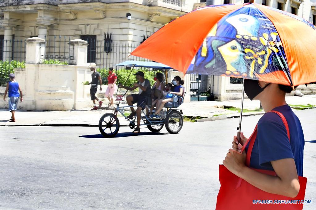 LA HABANA, 3 julio, 2021 (Xinhua) -- Una mujer sostiene un paraguas mientras camina por una calle, en La Habana, capital de Cuba, el 3 de julio de 2021. (Xinhua/Joaquín Hernández)