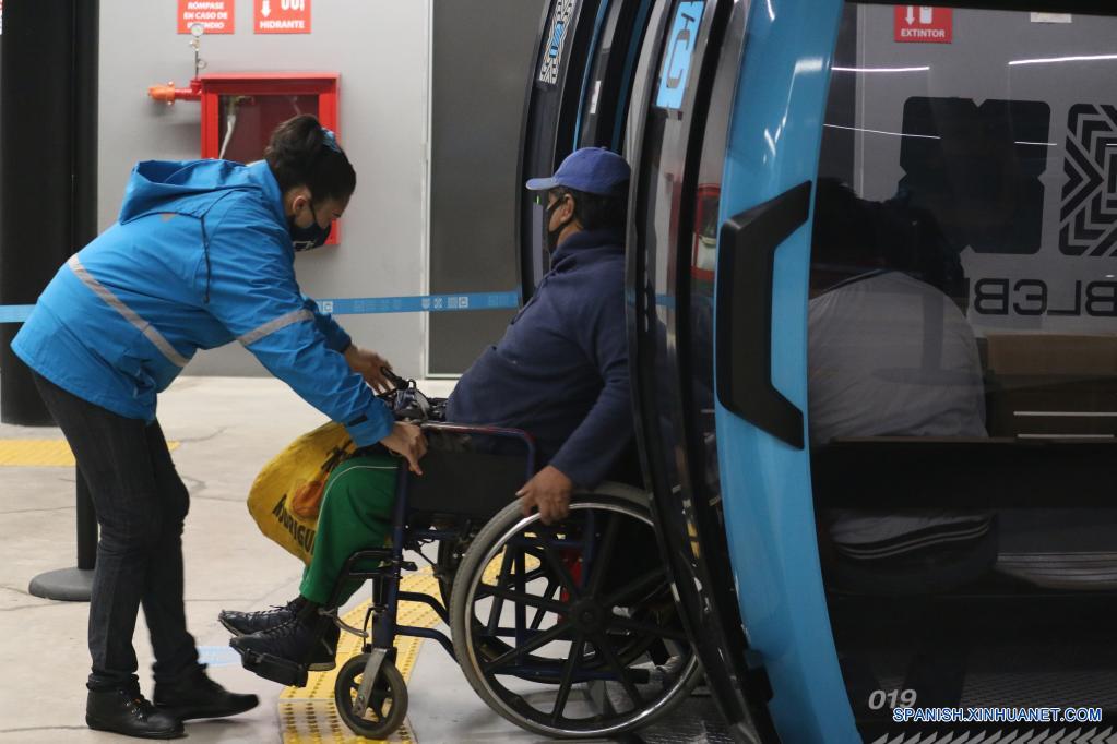 CIUDAD DE MEXICO, 17 julio, 2021 (Xinhua) -- Una mujer ayuda a un hombre en silla de ruedas a abordar una cabina de la Línea 1 del Cablebús, en la Ciudad de México, capital de México, el 17 de julio de 2021. La Línea 1 del Cablebús cuenta con seis estaciones y conecta con otros sistemas de transporte como la Línea 3 del Metro y las Líneas 1 y 7 del Metrobús. Este nuevo transporte ayudará a la movilización de miles de ciudadanos en la zona norte de la ciudad. (Xinhua/Silvana Flores)