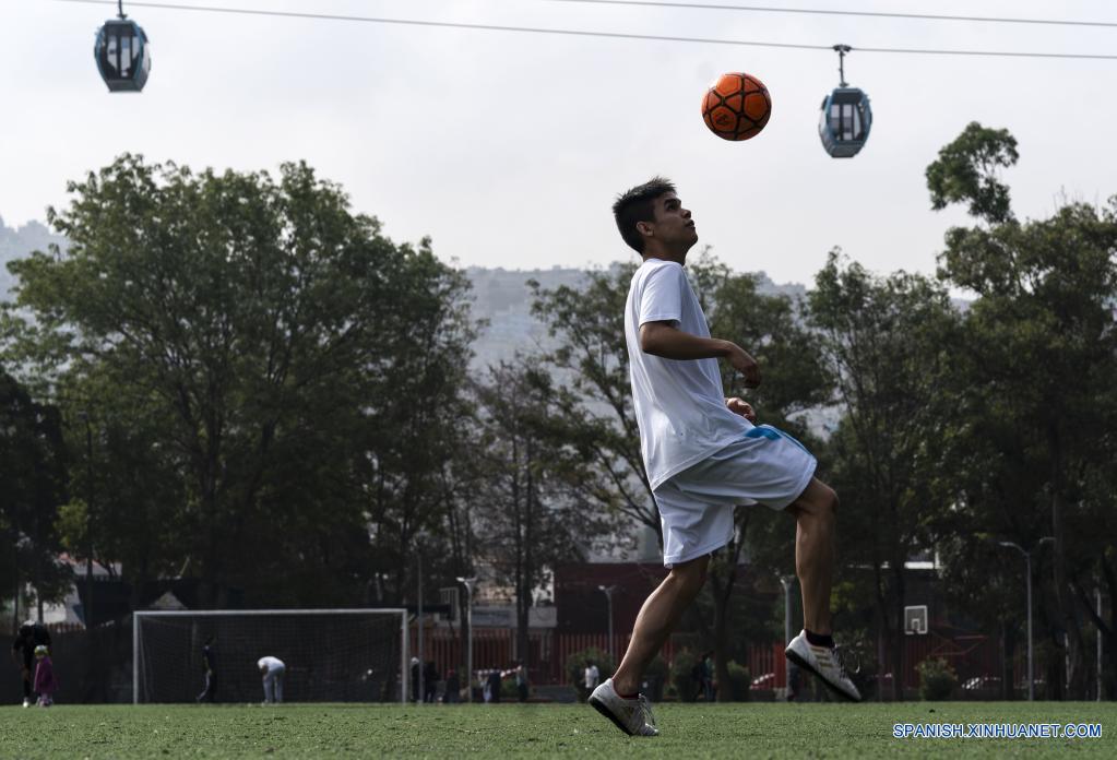 CIUDAD DE MEXICO, 17 julio, 2021 (Xinhua) -- Un joven juega fútbol frente a cabinas de la Línea 1 del Cablebús, en la Ciudad de México, capital de México, el 17 de julio de 2021. La Línea 1 del Cablebús cuenta con seis estaciones y conecta con otros sistemas de transporte como la Línea 3 del Metro y las Líneas 1 y 7 del Metrobús. Este nuevo transporte ayudará a la movilización de miles de ciudadanos en la zona norte de la ciudad. (Xinhua/David de la Paz)