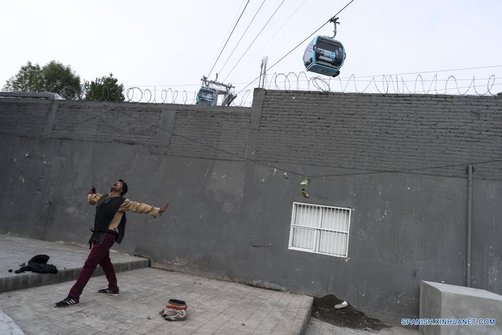 CIUDAD DE MEXICO, 17 julio, 2021 (Xinhua) -- Un hombre observa las cabinas de la Línea 1 del Cablebús, en la Ciudad de México, capital de México, el 17 de julio de 2021. La Línea 1 del Cablebús cuenta con seis estaciones y conecta con otros sistemas de transporte como la Línea 3 del Metro y las Líneas 1 y 7 del Metrobús. Este nuevo transporte ayudará a la movilización de miles de ciudadanos en la zona norte de la ciudad. (Xinhua/David de la Paz)