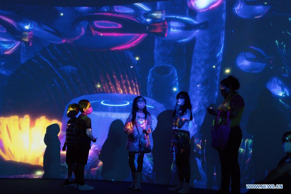 CIUDAD DE MEXICO, 16 julio, 2021 (Xinhua) -- Niños observan una proyección del océano en el Universum, Museo de las Ciencias de la Universidad Nacional Autónoma de México, luego de permanecer cerrado debido a la pandemia de la enfermedad del nuevo coronavirus (COVID-19), en la Ciudad de México, capital de México, el 16 de julio de 2021. (Xinhua/Salvador Chávez)