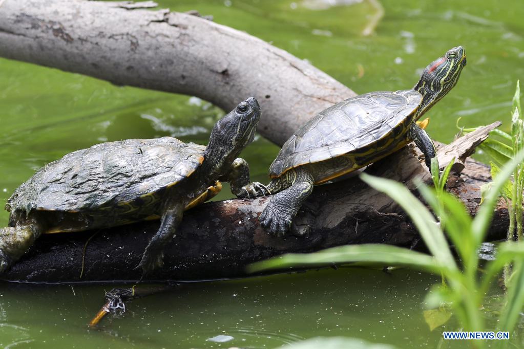 SANTA LUCIA, 21 julio, 2021 (Xinhua) -- Imagen del 21 de julio de 2021 de dos tortugas en una laguna del municipio de Santa Lucia, en el departamento de Francisco Morazán, Honduras. (Xinhua/Rafael Ochoa)