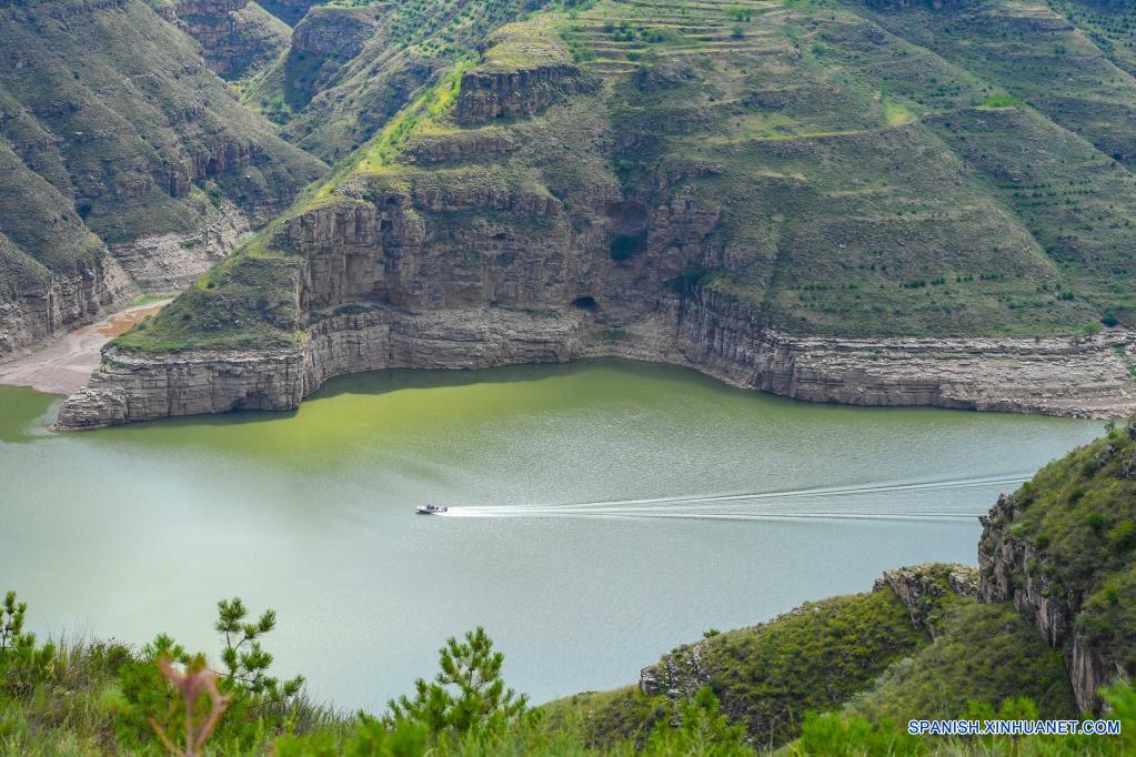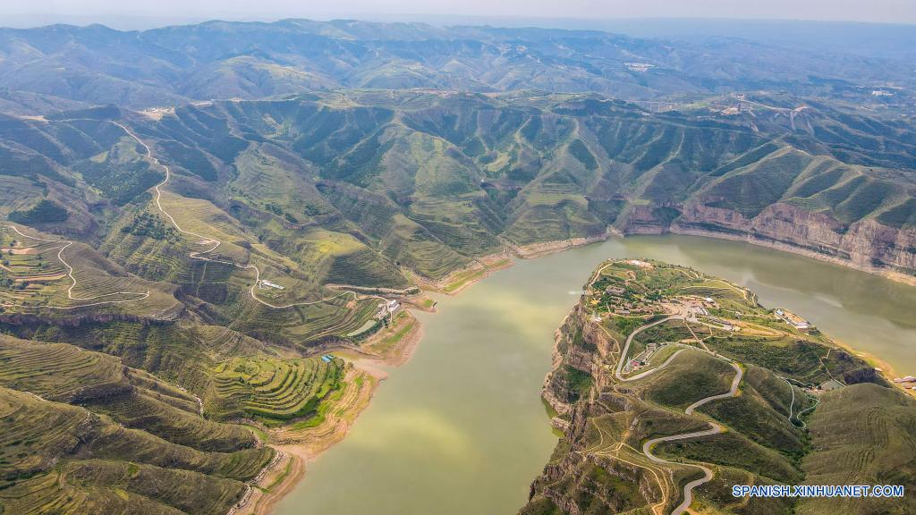 ORDOS, 22 julio, 2021 (Xinhua) -- Vista aérea del 21 de julio de 2021 del paisaje del cañón del Río Amarillo, en la bandera de Jungar, en la región autónoma de Mongolia Interior, en el norte de China. (Xinhua/Peng Yuan)