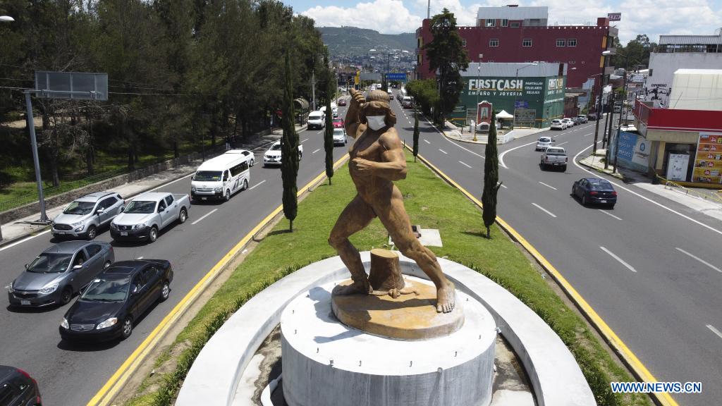 TLAXCALA, 28 julio, 2021 (Xinhua) -- Imagen tomada con dron del 28 de julio de 2021 de la escultura del Monumento a Tlahuicole portando una mascarilla en Tlaxcala, México. (Xinhua/Jesús Alvarado)