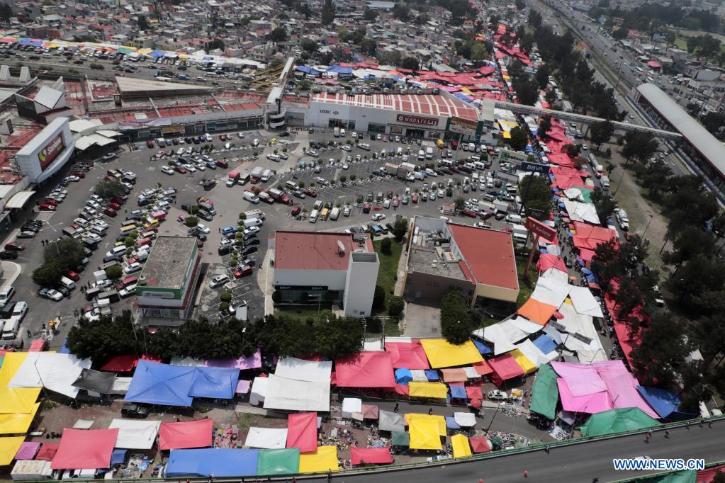 NEZAHUALCOYOTL, 28 julio, 2021 (Xinhua) -- Vista aérea del 28 de julio de 2021 de un tianguis en Nezahualcóyotl, México. (Xinhua/Quetzalli Blanco)
