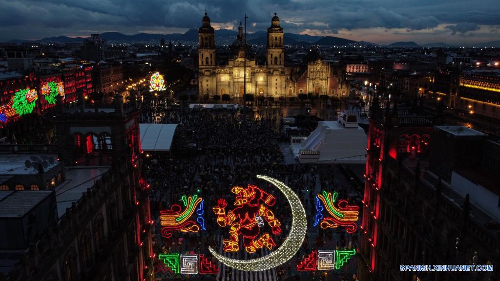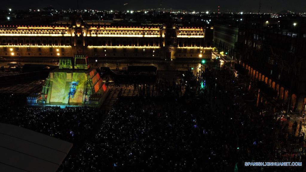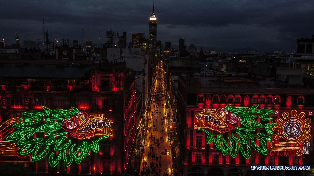 CIUDAD DE MEXICO, 13 agosto, 2021 (Xinhua) -- Imagen tomada con un dron de la iluminación conmemorativa por los 500 años de la Resistencia Indígena México-Tenochtitlán, en el Centro Histórico de la Ciudad de México, capital de México, el 13 de agosto de 2021. (Xinhua/Jesús Alvarado)